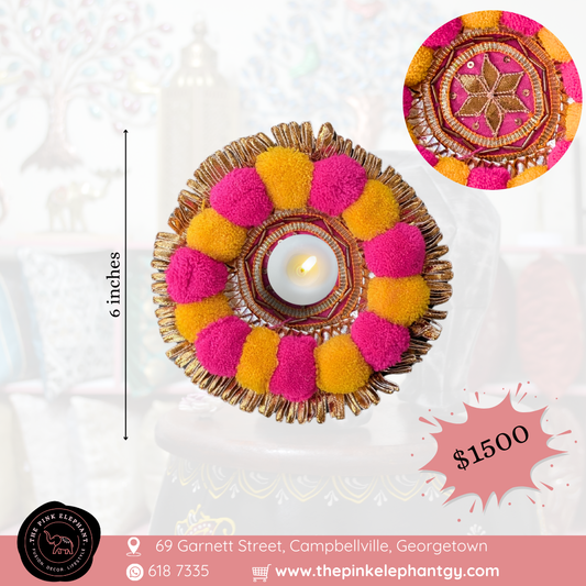 Tealight Pink and Yellow Pom Pom Rangoli 5"